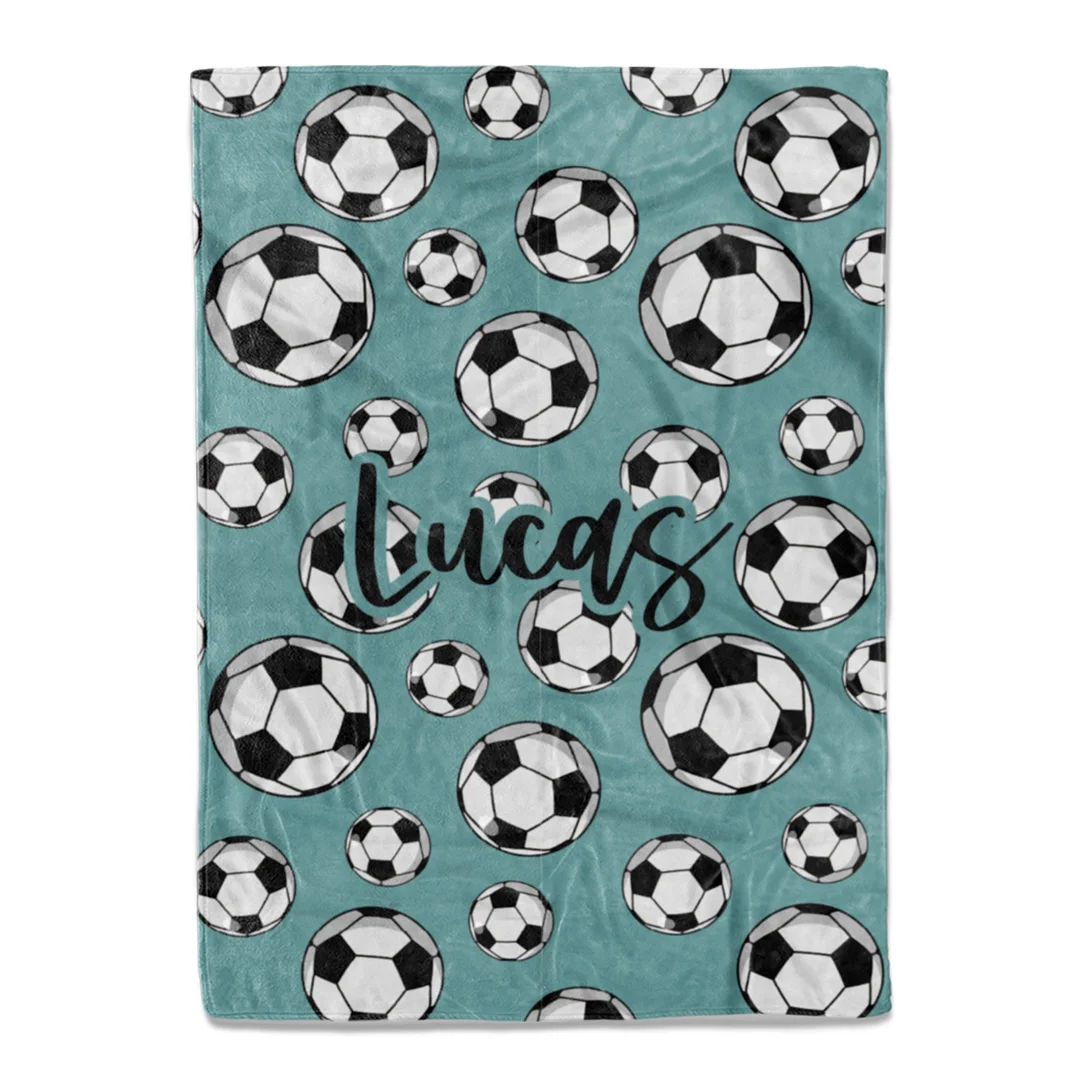 Score big with our personalized soccer blankets! Featuring a lively soccer ball print, these soft flannel blankets make ideal gifts for the soccer player or fan in your life. Lightweight yet cozy, they can tackle gameday at the field or snuggling at home. Customize with any name or initials in a sporty font. With its vibrant soccer design, flannel fabric and custom options, this blanket lets you create a one-of-a-kind gift as unique as your recipient!