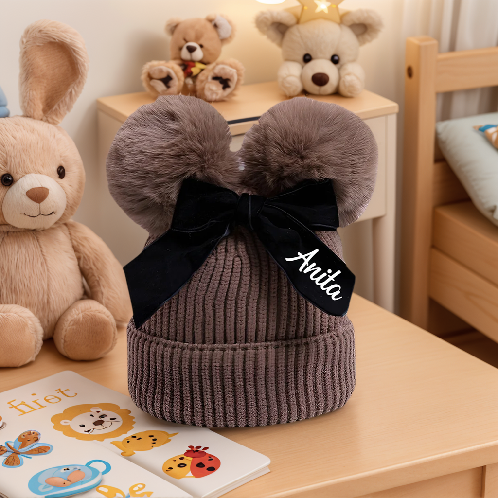 • The charming design features two fun bobbles and an elegant bow, adding a touch of playfulness and style to any winter outfit. The ability to personalize the beanie with your child's name makes it truly one-of-a-kind, turning it into a keepsake that both parents and children will treasure. Whether you're preparing your baby's winter wardrobe or looking for a unique, personalized gift, this custom beanie is a standout option.