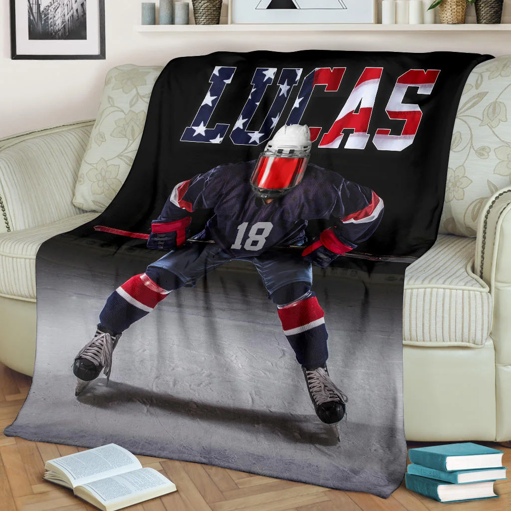 Personalized Hockey Blanket, Ice Hockey Player Sherpa Fleece Blanket | BKKid552